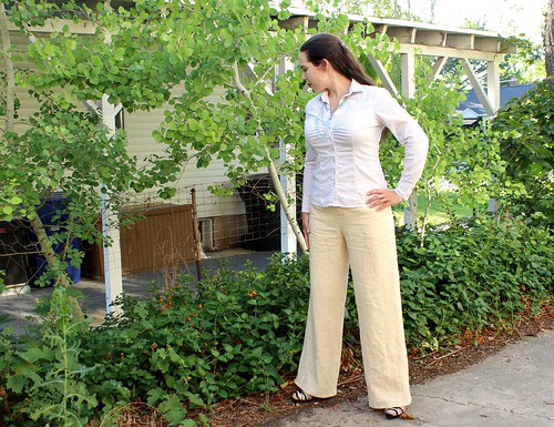 The fabric I used is a semi sheer linen from FabricMart, so I lined the pants with Ambiance. They feel lovely on. The pocketing and facings are poly/cotton batiste.